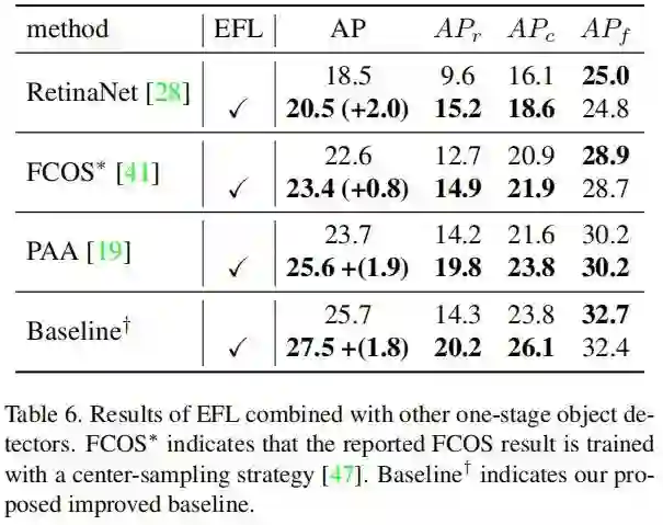 为了演示EFL在不同阶段检测器上的泛化能力,分别将其与RetinaNet、FCOS∗、PAA和改进的Baseline相结合。如表6所示,EFL在所有这些方法测试中都表现良好。与表1中的EQLv2和focal loss组合相比,提出的EFL相对于原检测器保持了稳定的较大性能提高(约+2% AP)。此外,EFL极大地提高了这些检测器在稀有类别上的性能,这表明在解决长尾分布问题方面的实力。