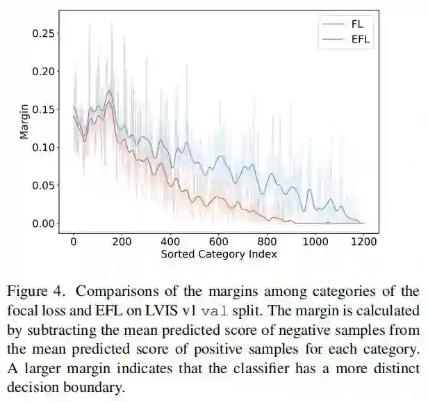 研究了EFL是否比罕见类别分类器上的Focal Loss具有更明显的决策边界。由于决策边界不能直观地显示,因此采用类别间正样本和负样本之间的经验边界来反映这些边界。边际是通过用每个类别的正样本的平均预测分数减去负样本的平均预测分数来计算的。由于EFL非常关注罕见类别的正负失衡问题,因此在EFL中,这些类别的阳性样本与阴性样本之间的差距应该很突出。如图4所示,在罕见类别中,阳性样本和阴性样本之间保持了较小的边缘。相比之下,提出的EFL增加了所有类别的边界,特别是对于稀有类别,带来了更明显的决策边界。