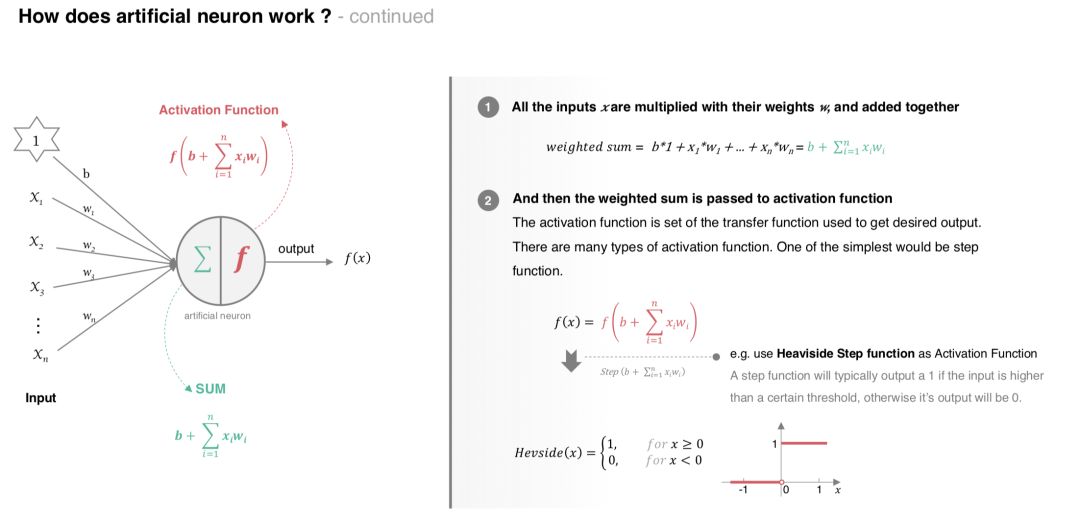 例如,下图中的概念解释很形象地展现了生物神经元和人工神经元工作方式的相似性。