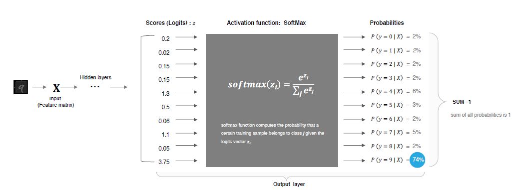 用神经网络分类手写数字的前向传播示例(softmax 激活函数)。