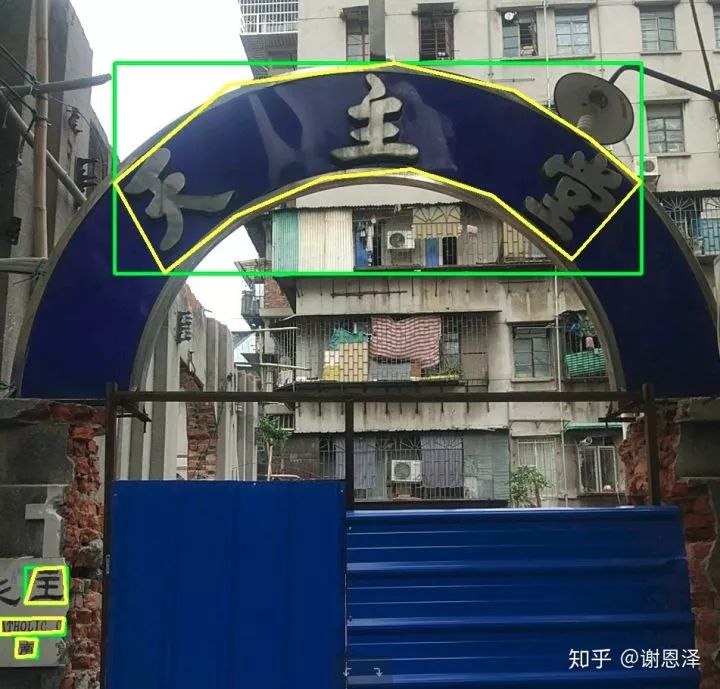 当然,只有 Mask R-CNN 是不够的,实际中我们会遇到各种问题,比如说文字有一个很神奇的特性:文字框的某些部分还是文字,但是物体检测中的物体是没有这种局部性的。所以有时候会出现断框的情况,拿上图举例,可能你检测模型的结果是“天主”出了一个框,“堂”出了一个框,这样在评价指标下肯定是不如“天主堂”出一个框更好的。