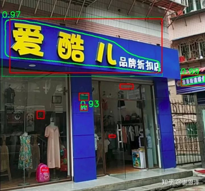 上图中的“爱酷儿”和“品牌折扣店”很容易检测成两个 box,但是采用我们的方法增大了模型的感受野之后就可以更好地解决这个问题,相比一些繁琐的后处理的方法也更加有效。