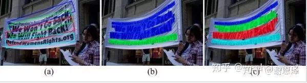 本文由旷视检测组和南京大学合作,从另一种思路去解决弯曲文字检测的问题,即像素级语义分割。考虑到基于 bounding box的方法无法很好地建模弯曲文字,语义分割方法对文字进行像素级分类,可以很容易建模弯曲文字,但是对于挨得很近的文本实例则无法区分,如下图所示。