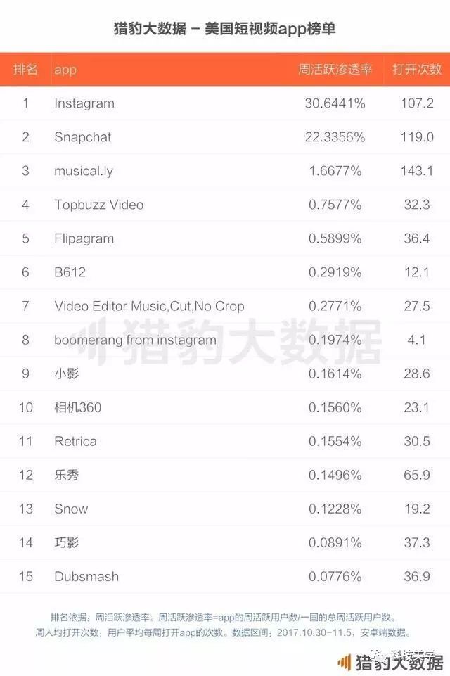 三年过去,musical.ly依然在猎豹大数据美国社交榜前十名,在短视频榜单排名第三,经历了从“工具”到“社区”再到“社交网络”的蜕变。