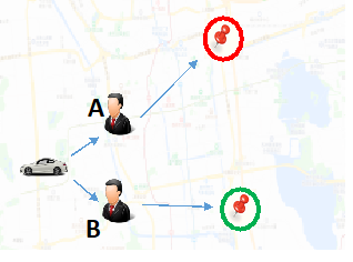 第一个例子是供给受限的情况,这里有一个司机,两个乘客A跟B分别前往”热区”和”冷区”,假设其他影响派单的因素完全一样 (接驾距离、安全合规、合规司机收入倾斜、服务分等)。那么可以认为把乘客A派给司机是更优的选择 (实际情况更为复杂,比如在供需不平衡的情况下引入排队机制),因为司机在完成A订单后可以更好的满足”热区”运力不足的需求,从而在整体上减少司机的空车时间,达到调节供需的作用;