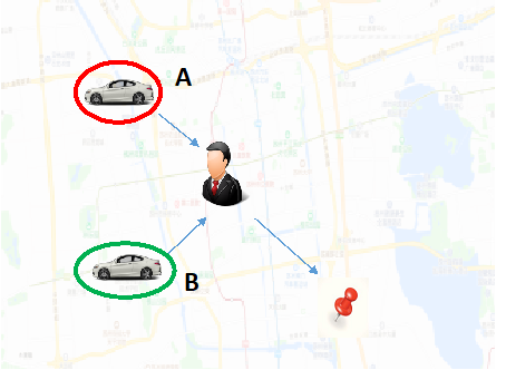 第二个例子是需求受限的情况。假设这里有一个乘客,司机A跟B分别在”冷区”和”热区”,而其他影响派单的因素完全一样,那么在这个情况下,可以认为把订单派给A会是更好的选择,因为B在”热区”期望上能比A更快地接到下一单,这样长期来看总体上最小化了A跟B的空车时间。
