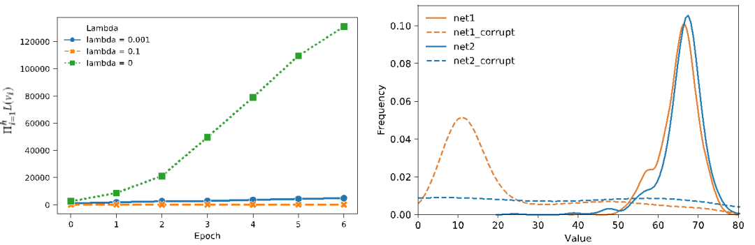 在训练中我们提出一种新的结合了Lipschitz正则化的策略估计方法,通过直接控制Lipschitz常量来学习得到一个更光滑的价值函数。价值函数光滑程度的重要性主要体现在增强状态输入之间关联性以及提高非线性价值迭代的收敛性两方面。如下图所示,黄色跟蓝色分别代表使用了和没有使用Lipschitz正则化的神经网络。一开始两个网络的输入分布几乎重合,在对网络参数加入了相等大小的噪声后,蓝色分布发生了剧烈变化,而黄色分布则体现了对噪声的鲁棒性。