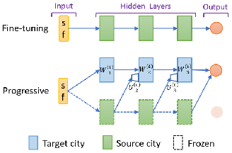 现实中派单具有很强的区域性,一般以城市为中心,不同的城市因为地理位置,气候特征等不同而在供需动态等方面有不同的特性,这可以看作一个典型的多任务学习问题。我们针对派单中的价值估计提出了一种基于progressive network的新的多城市迁移学习框架,可以有效地利用数据量丰富的城市数据来促进对数据稀疏的城市的价值估计;另外,通过在迁移过程中针对不同输入建立不同lateral connection网络能够在训练中更专注于有效的迁移 (比如实时特征的处理) 以及通过训练决定迁移的具体方式及强度 (调整lateral connection的权重)。