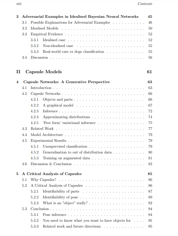 设计具有不确定性的深度学习模型,使其能够在预测的同时提供合理的不确定性,一直是部分机器学习社区的目标。从业者也经常需要这样的模型。最普遍和最明显的方法是采用现有的深层架构,并尝试将现有的贝叶斯技术应用于它们,例如,将神经网络的权重作为贝叶斯框架中的随机变量处理。本文试图回答这个问题: 现有的神经网络架构是获得合理不确定性的最佳方式吗?在本文的第一部分,我们提出了在对抗环境下贝叶斯神经网络的不确定性行为的研究,这表明,虽然贝叶斯方法在数据分布附近的确定性网络上有显著的改进,但外推行为是不受欢迎的,因为标准神经网络架构在结构上偏向于自信外推。基于此,我们探索了两种标准深度学习架构的替代方案,试图解决这一问题。首先,我们描述了一种新的胶囊网络生成公式,它试图通过对场景结构的强假设来将结构强加到学习任务中。然后,我们使用这个生成模型来检查这些潜在的假设是否有用,并论证它们实际上存在重大缺陷。其次,我们探索了bilipschitz模型,这是一种解决深度神经网络中确保先验回归这一更有限目标的体系结构。这些方法基于深度核学习,试图通过使用最终分类层来控制神经网络的行为,当与支持向量集的距离增加时,分类层会恢复到先验值。为了在使用神经特征提取器的同时保持这一特性,我们为这些模型描述了一种新的“bilipschitz”正则化方案,该方案基于通过施加由可逆网络上的工作激发的约束来防止特征崩溃。我们描述了这些模型的各种有用的应用,并分析了为什么这种正则化方案似乎仍然有效,即使它背后的原始动机不再成立,特别是在特征维度低于输入的情况下。我们的结论是,虽然胶囊网络可能不是一个有前途的方向,但本文最后部分讨论的模型是未来研究的一个富有成果的领域,在许多应用中作为标准贝叶斯深度学习方法的一个有前途的潜在替代方案。
