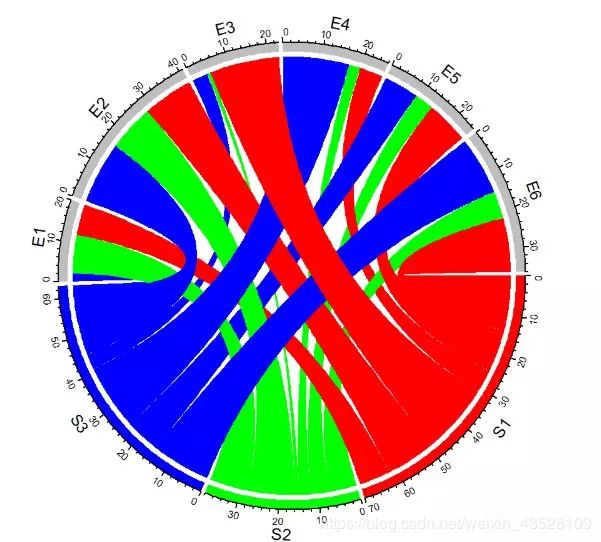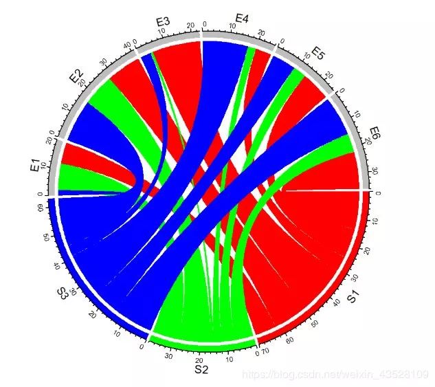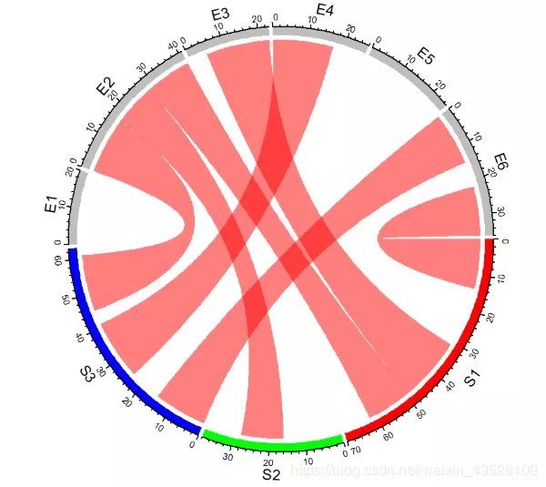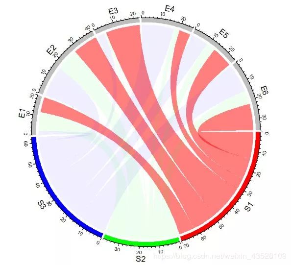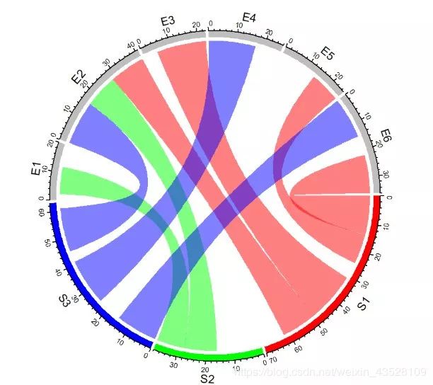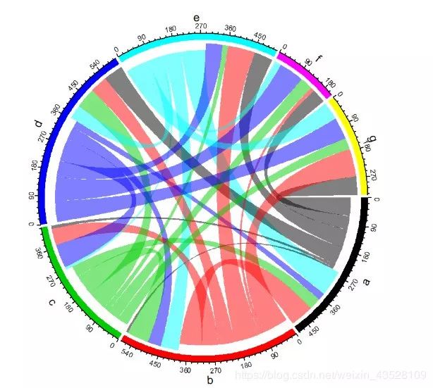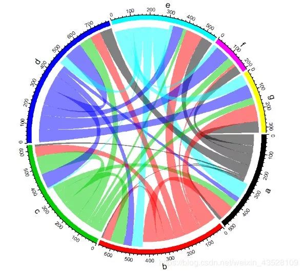 chordDiagram(mat, grid.col = grid_col, transparency = 0, link.rank = rank(mat)) # 用mat中的秩进行排序,秩最大先添加