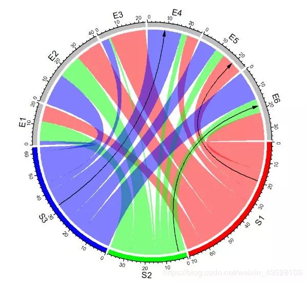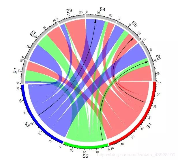chordDiagram(matx, directional = 1, direction.type = c("diffHeight", "arrows"),