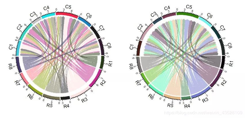chordDiagram(mat, grid.col = grid_col, transparency = 0, link.rank = )# 设置透明度为0,方便观察