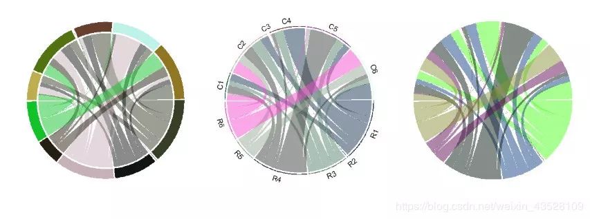 chordDiagram(mat, grid.col = grid_col, row.col = c("#FF000080", "#00FF0010", "#0000FF10"))