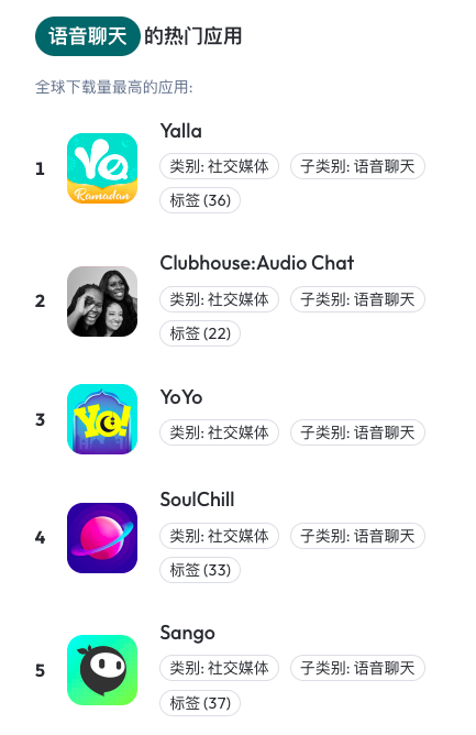 data.ai显示,全球下载量排名前5的语音社交产品分别是Yalla、Clubhouse、YoYo、SoulChill和Sango,除了去年火爆一时的Clubhouse,其余4款应用均来自中国。