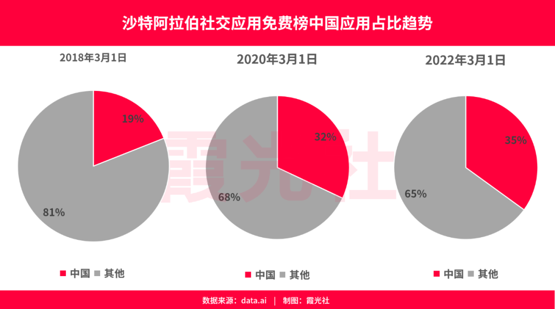 2018年3月1日,有19款中国应用进入沙特阿拉伯的社交应用免费下载榜Top100,到了2022年3月1日,这一数字上升至35款,前10名里更是占据6席;而在社交应用畅销榜中,这一数字从2018年的26款上升至如今的48款。