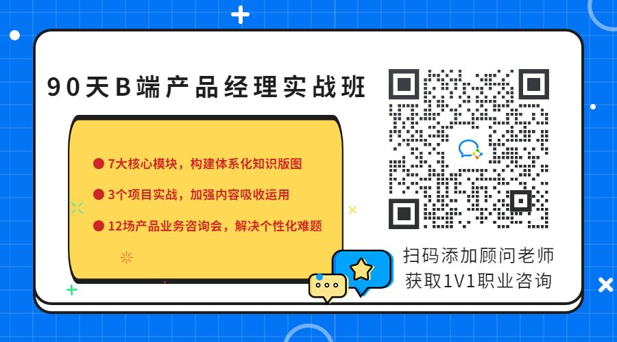 扫码添加顾问老师获取1V1职业咨询,更有《90天B端产品经理实战班》课程,帮你掌握B端产品建设的核心方法论,实现专业技能提升。