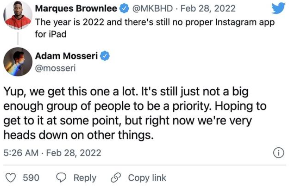Instagram高管Adam给出的答复是,“我们经常收到这样的信息,但没有足够多的用户让此成为优先事项”。