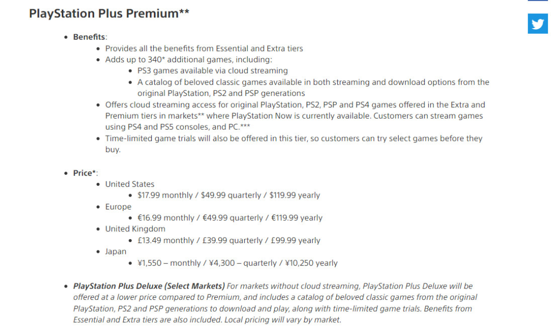 PlayStation Plus Premium,提供 Essential 和 Extra 两档的所有福利,外加 340 款游戏,包括可以云端串流的 PS3 游戏以及 PS1,PS2 和 PSP 世代的游戏库,支持串流和下载游玩。