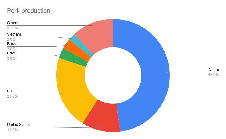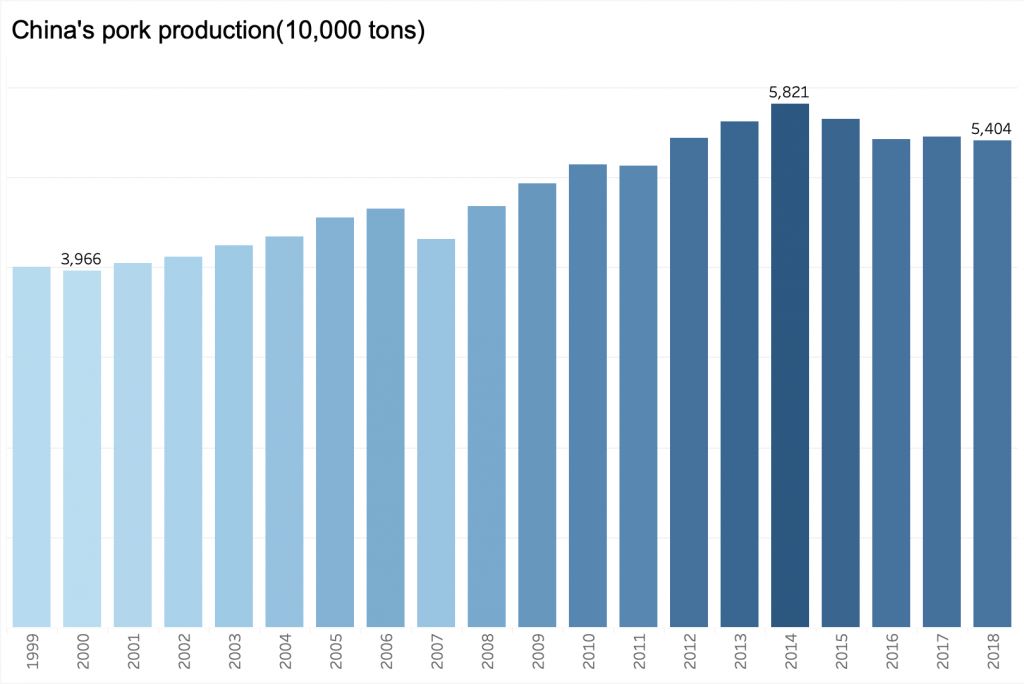 中国饲养了近7亿头猪,相当于全球猪肉供应量的一半以上。在过去的10年里,中国人均猪肉消费量超过30公斤,猪肉,是我们最常食用的肉类。2016年,国内猪肉销售额最高达到1.4万亿元人民币,占全年GDP的近2%。2018年,中国居民总计消费5490万吨猪肉,占肉类总量的62%以上。