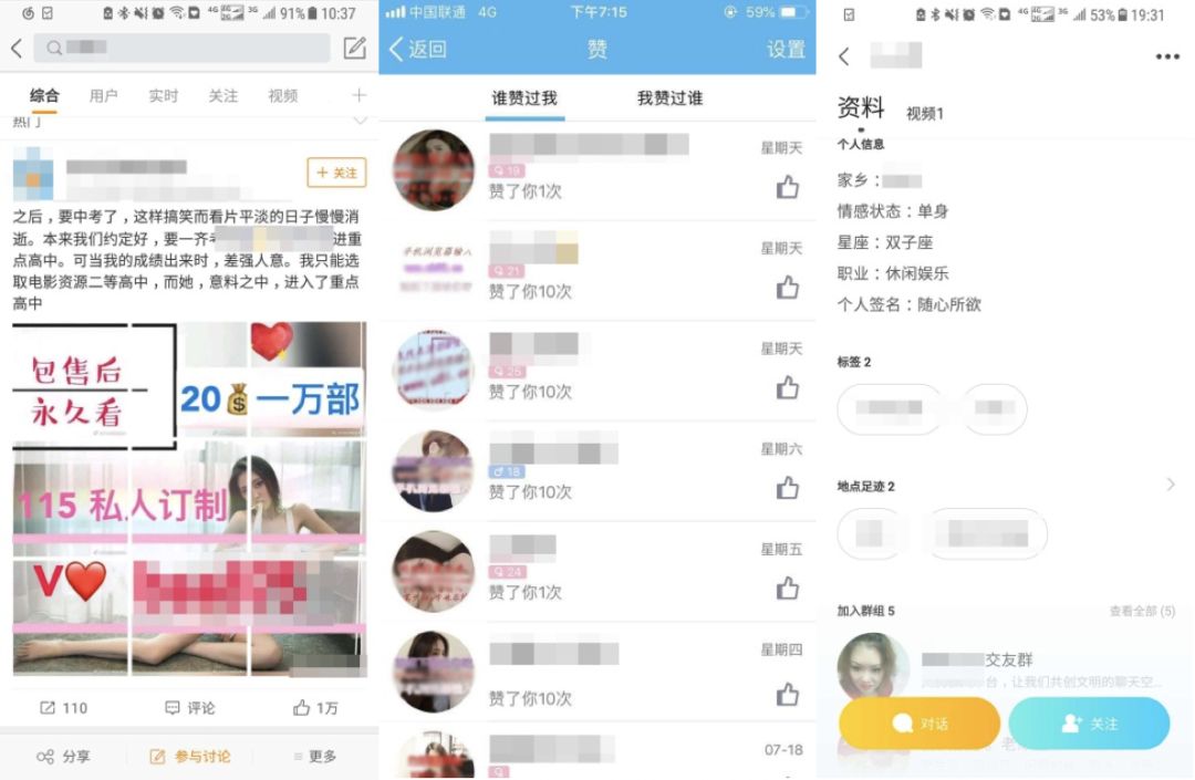 通过多个关键词的热门推荐,“卖片”者已经拥有了高量IP,并且搜索这些敏感词汇的人群基本都是她们的“目标受众”,她们通常通过微博内容和评论区两个地方来引导人们+V