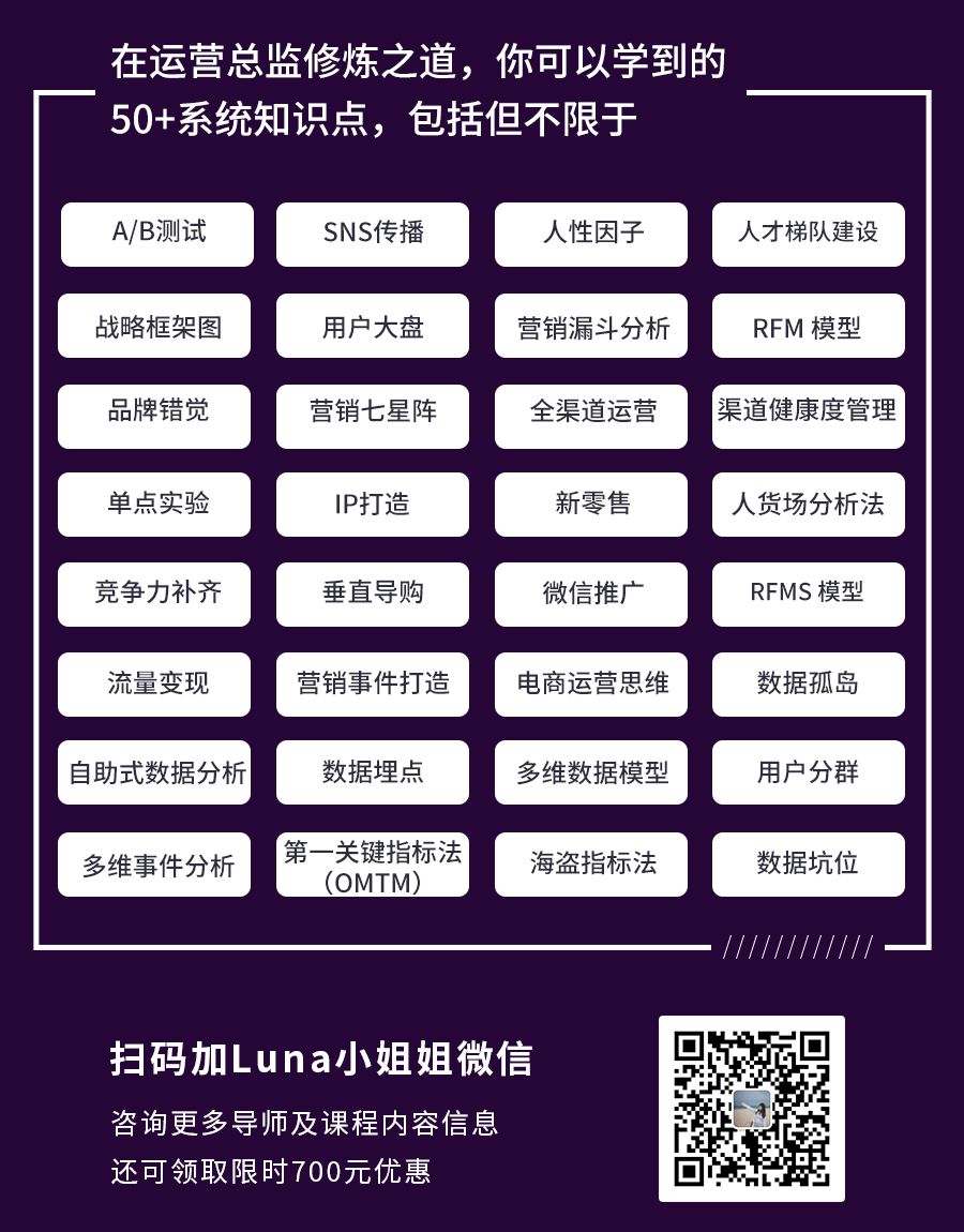 如果想系统了解更多袁野老师对流量变现和高阶运营知识的分析,欢迎加入袁野老师和另外三位老师一起打磨的运营总监修炼之道。