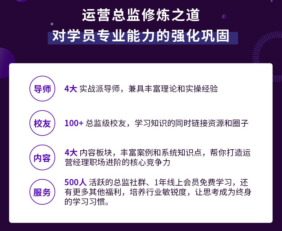 运营总监修炼之道,专为3年以上运营经理量身定制,四位授课老师通过线下面对面亲授形式,讲10年互联网的运营实战经验倾囊相授,致力于为行业运营经理的系统性成长和职场能力进阶提供更多帮助。