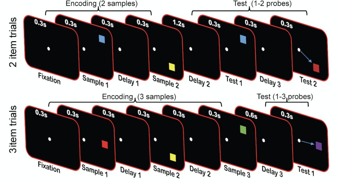 几年前,论文的作者之一Earl Miller和他的研究团队曾进行过一项与工作记忆有关的试验,他们在屏幕上向猴子展示了一系列不同的图形(如下图):首先是一组彩色的正方形,紧接着是空白屏幕,然后播放一次初始屏幕的图案,但这次会改变其中一个正方形的颜色。猴子们必须检测屏幕与屏幕间的差异。屏幕上出现的正方形数量时而高于工作记忆容量、时而低于工作记忆容量。放置于猴子大脑深处的电极会记录下各种神经元在完成每项任务时产生的脑电波的时间和频率。