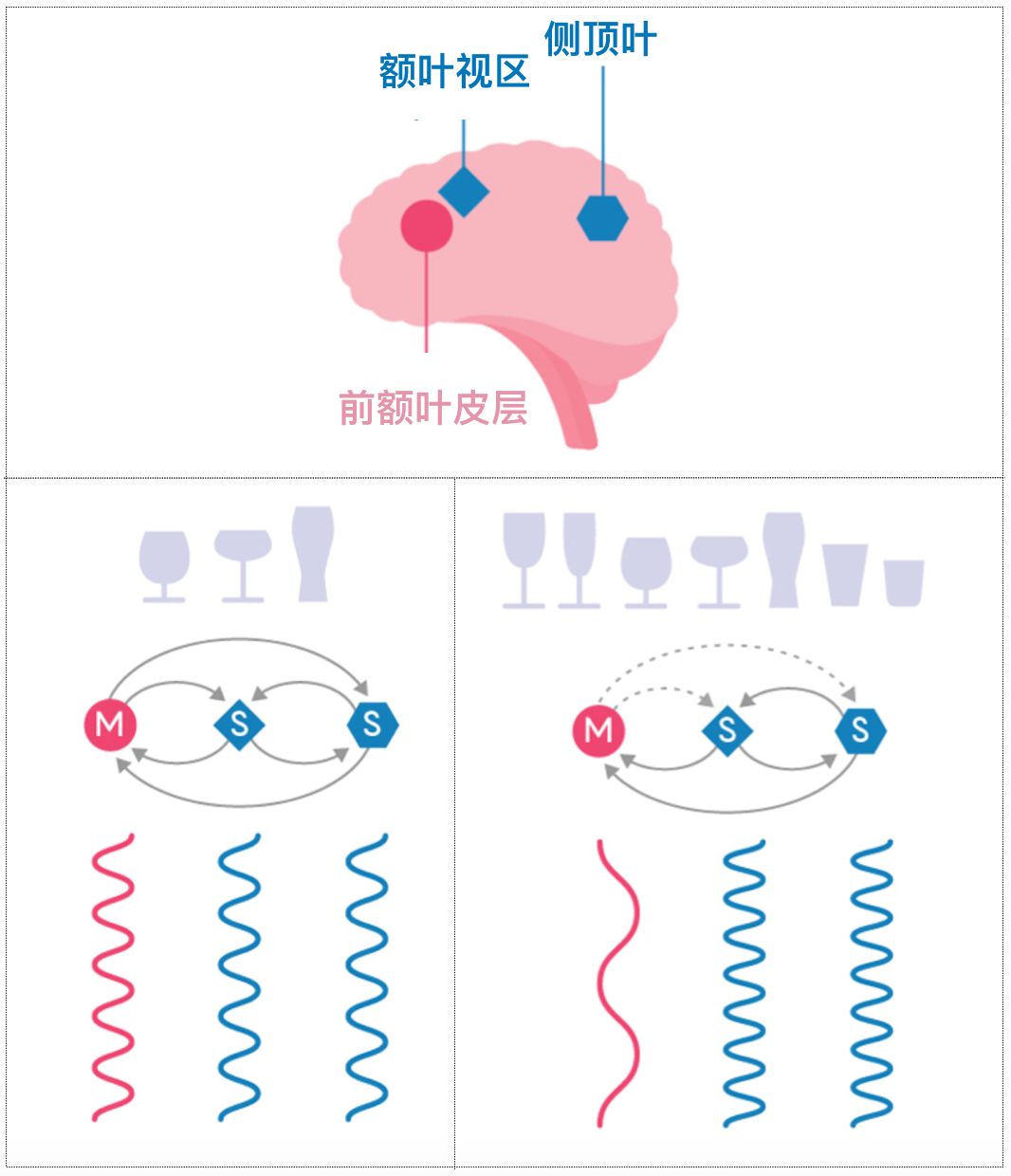 通过分析发现,当需要被记忆的事物数量超过猴子的工作记忆容量时,从前额叶皮层向其他两个区域输送的自上而下的反馈连接就会被打破,但前馈连接仍然完好。也就是说,通过模型我们发现,反馈信号的弱化导致大脑区域之间的同步性丧失。如果没有来自前额叶皮层的预测导向信号,工作记忆的网络就无法同步。