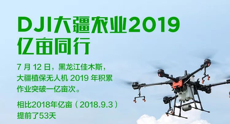 目前,DJI 大疆农业是2019年国内唯一突破亿亩规模的植保无人机品牌。相比2018年,今年亿亩数据达成时间提前了53天,DJI 大疆农业随后发布了《2019年亿亩同行》无人机植保数据报告。