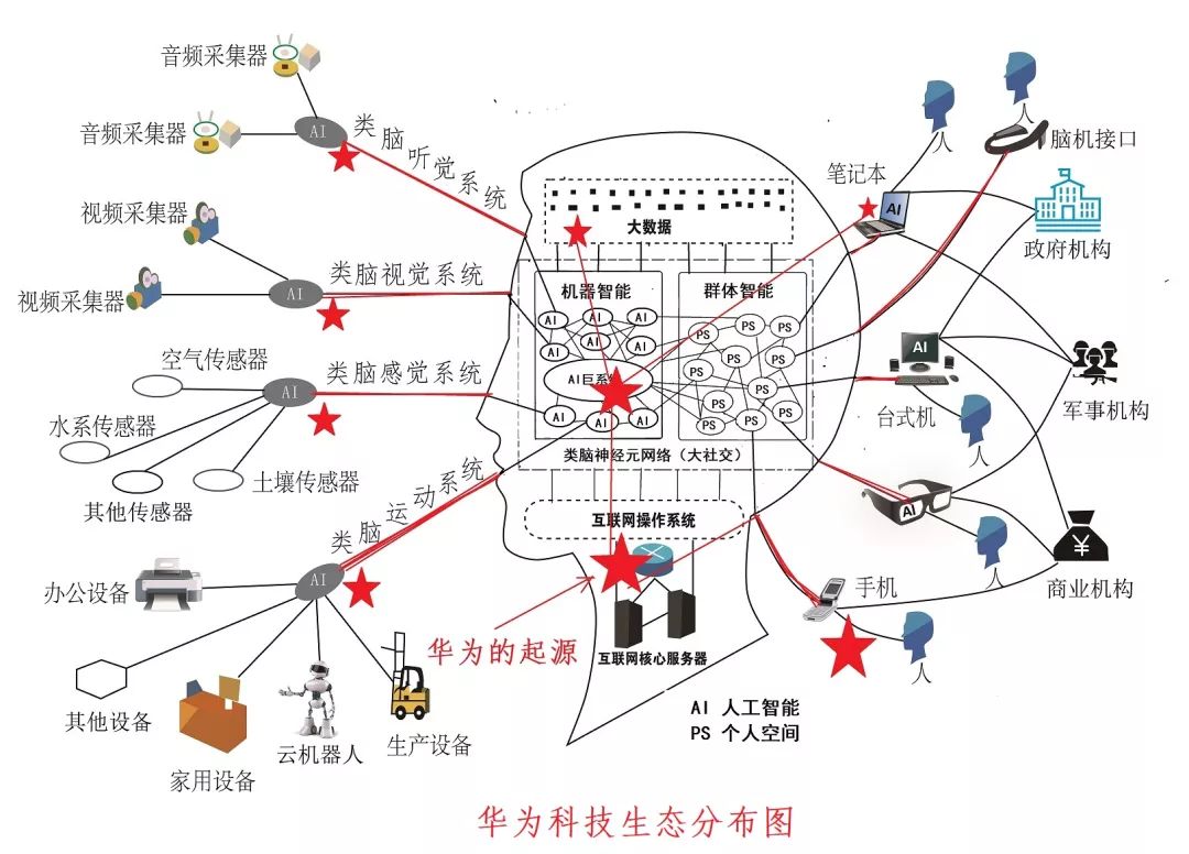 从上述图中可以看出,华为公司的科技生态,主要涉及到互联网的路由与交换机设备; 互联网的神经纤维(互联网通讯);互联网视觉、听觉,感觉和运动神经系统的神经末梢(边缘计算);智能手机与移动互联网;互联网云机器智能(华为云)