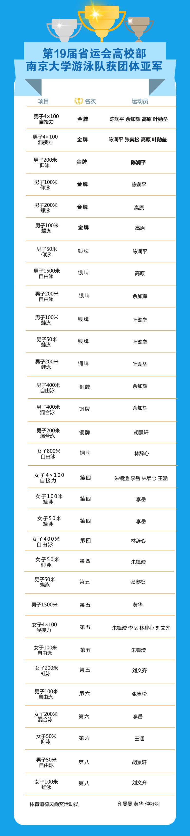 在这一江苏省大学生最高级别的比赛中,南京大学游泳队在游泳池中奋力拼搏,最终获得了普通学生组团体总成绩第二名的好成绩,游泳项目是南大所有参加本届省运会的体育项目中得分最多、排名最高的一个项目。