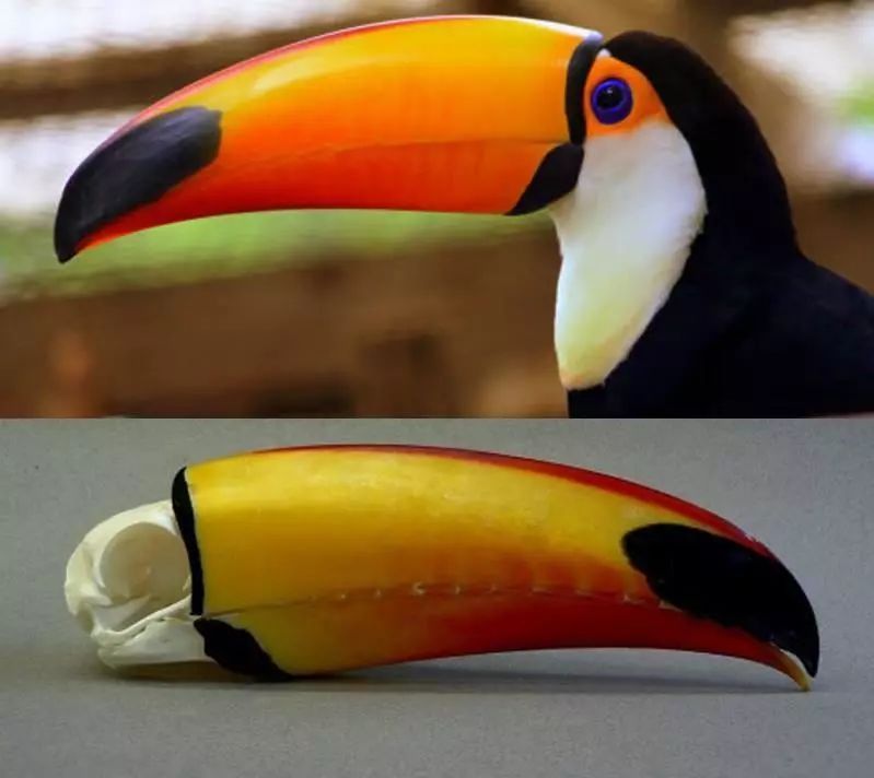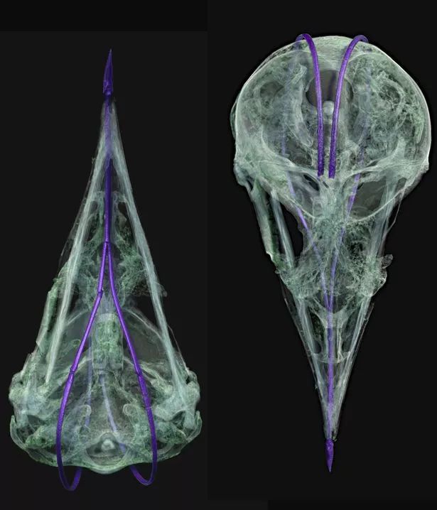 △ 英国特灵自然历史博物馆的啄木鸟CT扫描。紫色的是它的舌头,可以看到啄木鸟的舌头包裹着它的整个头颅。