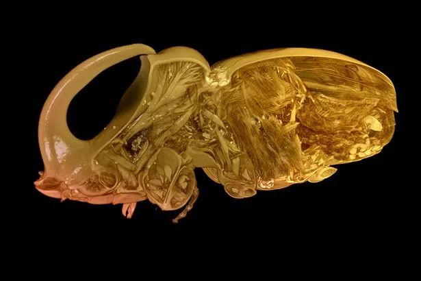 △ 独角仙,也叫兜虫(rhinoceros beetle)的CT扫描图。
