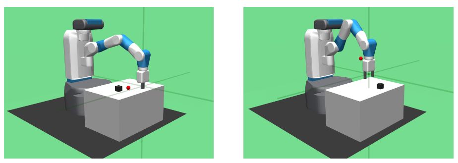 (左图)FetchReach-v0:Fetch 需要移动它的终端效应器到目标位置上。(右图)FetchSlide-v0:Fetch 需要打击一个冰球以使其滑动穿过长桌,然后停在目标位置上。