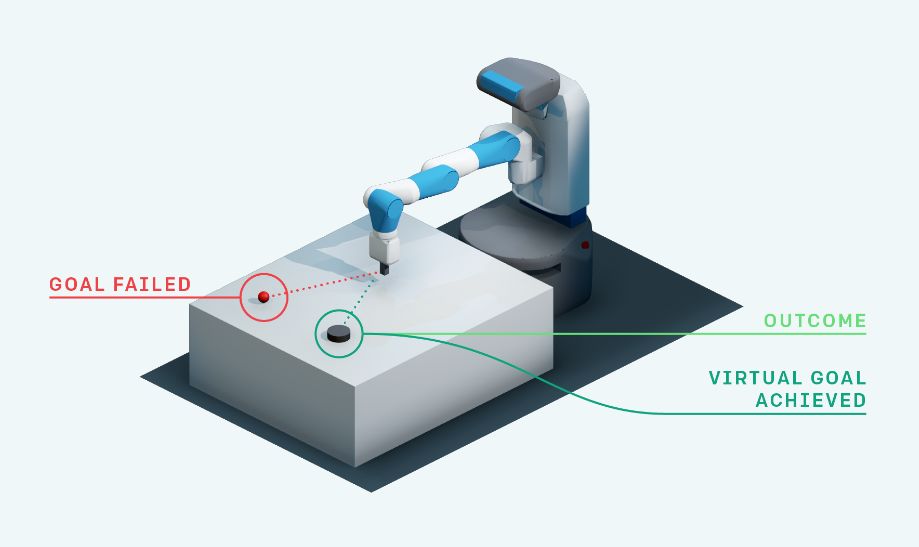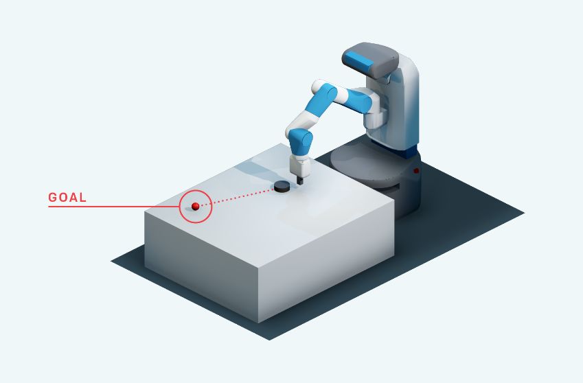 要理解 HER,我们需要先看一看 FetchSlide 的内容,一个我们要学习去滑动在桌子上的冰球然后打击目标的任务。我们第一次尝试非常可能失败。除非我们非常走运,后面几次同样也会失败。一般强化学习算法不会从这样的经验学习什么,因为他们的奖励(reward)是固定值(在这个案例中是-1),这样的奖励不包含学习信号,从而算法不会去学习。