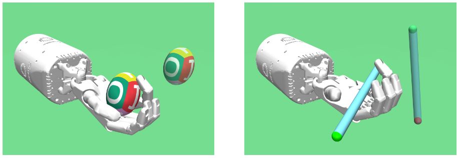 (左图)HandReach-v0:ShadowHand 用它的拇指和一个选定的其他手指延展到手掌上指定的地点。(右图)HandManipulateBlock-v0:ShadowHand 必须操纵一个块直到它到达了指定的地点和姿势。