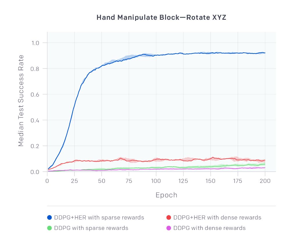 带有稀疏奖励的 DDPG+HER 明显优于其它所有的配置,并且只有稀疏奖励能在这个挑战性的任务中学习到成功的策略。有趣的是,DDPG + HER 在密集奖励的情况下也能够学习,但表现并不好。此外,原版 DDPG 在两种情况下都没有较好的表现。我们发现这种趋势在大多数环境中都是正确的,读者可以在技术报告论文中查看详情。