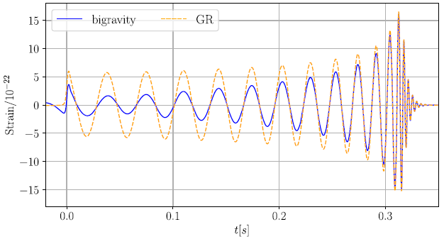 图5– 双引力模型和广义相对论所预测的引力波振荡对探测器畸变的调幅不同,可以看出双引力模型对畸变的调幅更明显