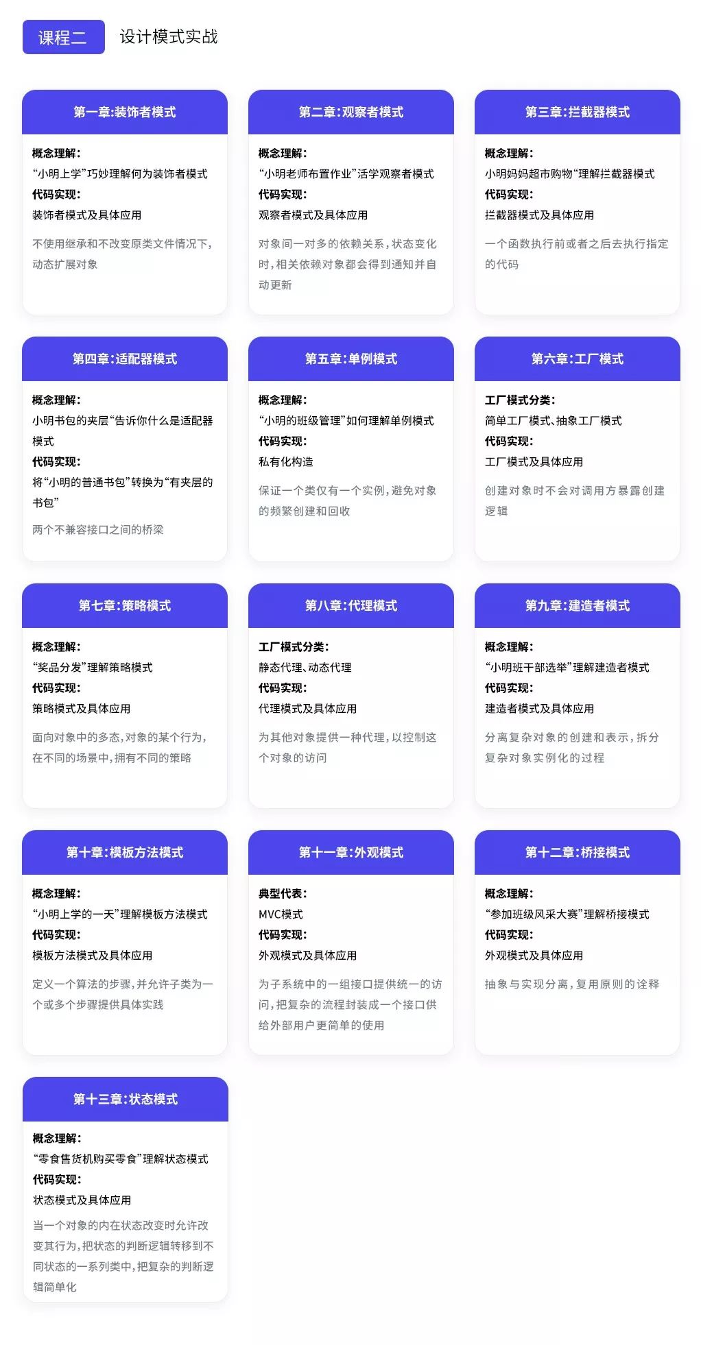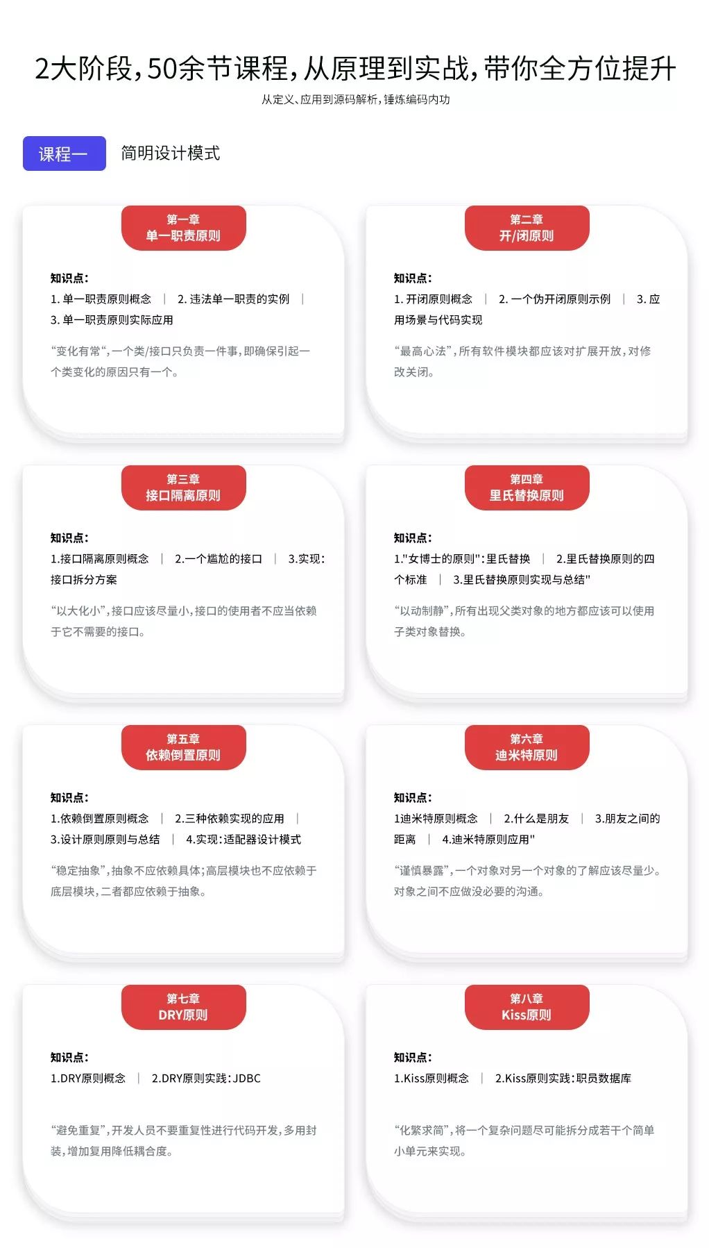 关于课程中涉及到的案例,都会从最原始的需求映射到代码,告诉你缺陷在哪里,如何通过设计原则、模式来优化。