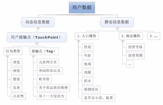 动态信息数据:用户不断变化的行为信息,如果存在上帝,每一个人的行为都在时刻被上帝那双无形的眼睛监控着,广义上讲,一个用户打开网页,买了一个杯子;与该用户傍晚溜了趟狗,白天取了一次钱,打了一个哈欠等等一样都是上帝眼中的用户行为。当行为集中到互联网,乃至电商,用户行为就会聚焦很多,如上图所示:浏览凡客首页、浏览休闲鞋单品页、搜索帆布鞋、发表关于鞋品质的微博、赞“双十一大促给力”的微博消息。等等均可看作互联网用户行为。
