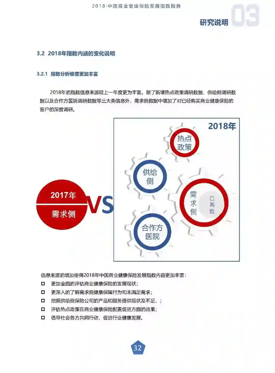 一是指数分析维度更全面。从单一的需求侧分析,扩展到包括寿险公司、财产险公司、健康险公司等商业保险公司在内的商业健康保险与服务的供给侧,项目组还对商保公司与医疗机构的合作状况开展调研,了解商业保险公司产品和服务供给现状和未来规划、当前发展水平和盈利情况、发展难度和期望,从供需结合的角度更全面地分析评估商业健康保险产品与服务的供求状况;