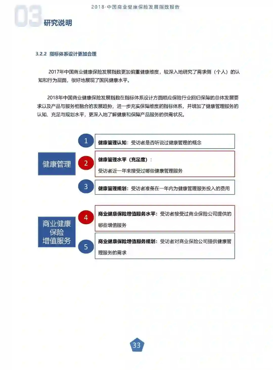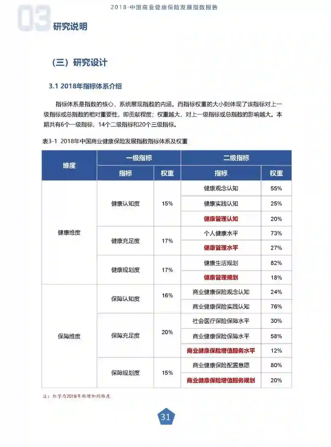 二是指标体系设计更合理。通过中国社科院、中国医学科学院、中日友好医院等专家的多轮充分论证,项目组对指标体系进行了较为细致的完善,在指标体系框架搭建方面,项目组顺应保险行业回归保障的总体发展要求以及商业健康保险产品与服务相融合的发展趋势,进一步充实保障维度的指标体系,并扩展了健康管理服务认知与规划方面的指标内容,共形成6个一级指标,14个二级指标和20个三级指标,更充分地反映了我国商业健康保险发展现状;