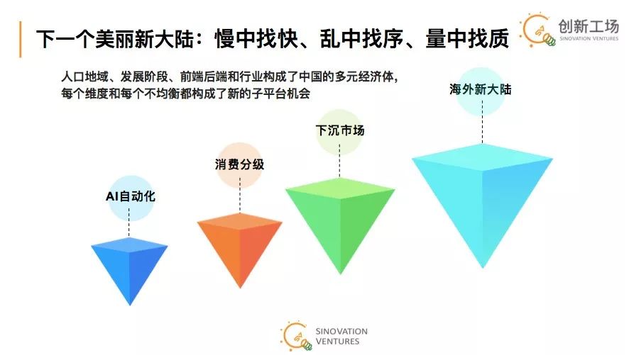 在他看来,中国不是单一经济体,它就像是一块魔方,是由人口地域、发展阶段、前端后端和不同分化的行业所分割的多元经济体。每个维度和每个不均衡都构成了新的子平台机会,市场颠覆式的机会仍在迸发。