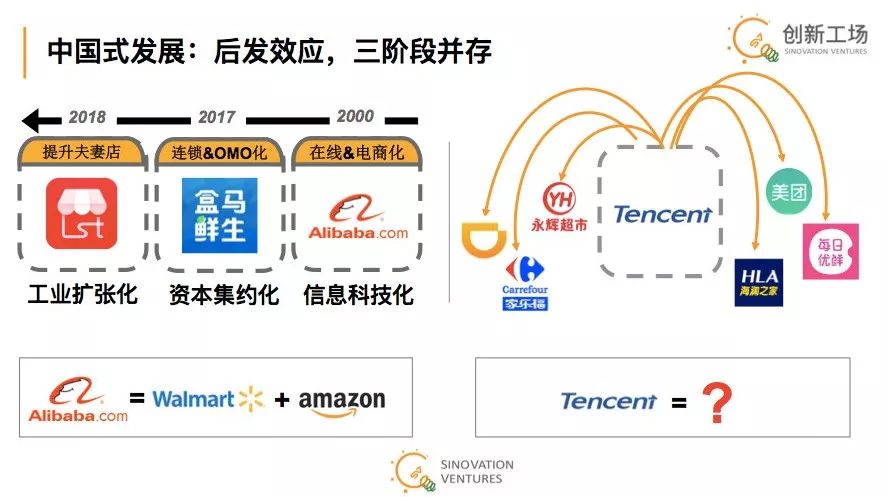 不同于欧美公司依次出现第一代巨头、第二代巨头、第三代巨头的顺序,中国先是出现腾讯、阿里,与永辉这类公司几乎是在同步发展,甚至中国第三阶段的公司先获取了市场份额和资本规模化,然后再倒过来对第二阶段、第一阶段的公司进行改造。而到现在为止,中国依然共存了无数的夫妻老婆店,无数的小业主,以零售为例,连锁化、集约化、资本化的路径刚刚还是没多久。