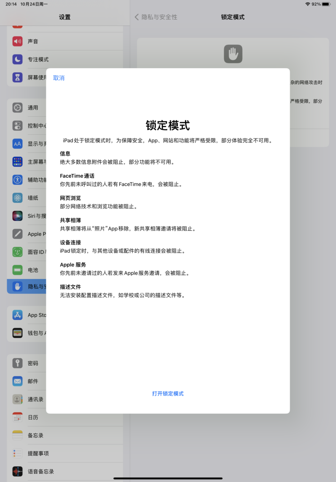 iPadOS 16.1 还更新了「锁定模式」,旨在为极少数用户提供可选的极端保护。在开启该模式以后,iPadOS 信息会将图片之外的绝大多数信息附件类型将被拦截、链接预览等部分功能将被禁用,Safari 浏览器会禁止用户设定白名单之外的网站使用 just-in-time (JIT) JavaScript 编译器等部分复杂网络技术,拒绝所有未经允许的 FaceTime 通话,锁定设备时与电脑或配件的有线连接也将被拦截,锁定模式开启后将无法安装配置文件且设备无法加入移动设备管理。这些措施有助于减少大幅减少受攻击面,以免给具高度针对性的间谍软件可乘之机。