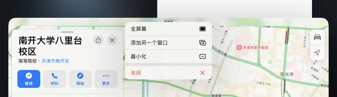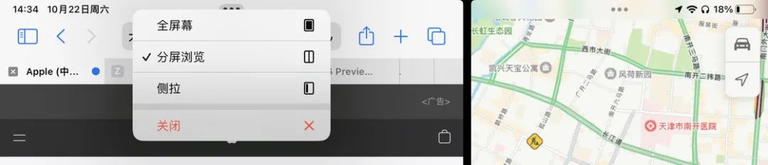 此外,iPadOS 15 引入的「多任务菜单」(即 App 窗口上方中间的三个小圆点)在 iPadOS 16 中也有所改进:现在点击多任务菜单,会有更加明确的指示,告诉用户可以对窗口进行的操作。例如,在台前调度的状态下,窗口可以「全屏幕」「最小化」,也可以直接在这里「添加另一个窗口」;而在普通的模式下,窗口则可以转变为「分屏浏览」或「侧拉」模式。