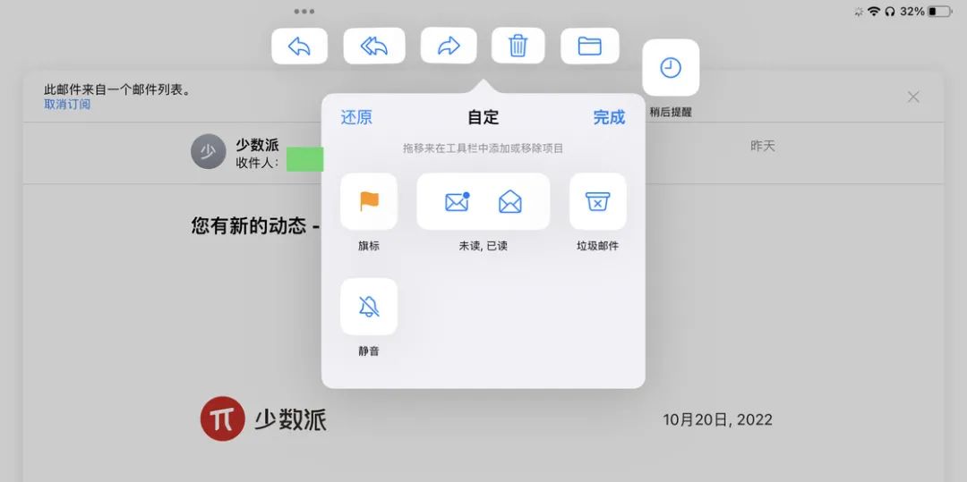 iPadOS 16.1 还在系统层面提供了开发者可进行适配的、可自定义的工具栏。这就好像 macOS 上常见的工具栏一样。目前,系统级 app,例如「邮件」「备忘录」等,已经添加了可以自定义的工具栏。以往需要依靠其他手势或菜单进行的一些操作,现在都可以在工具栏上一键完成。