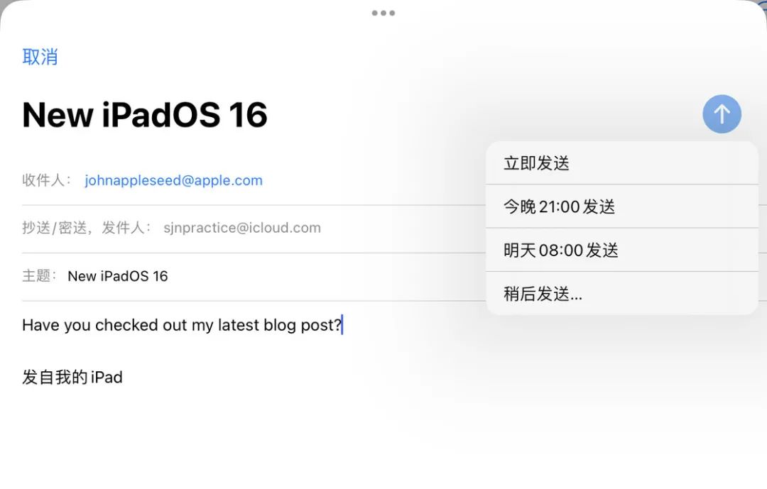 在 iPadOS 16 中,邮件应用也获得了不少实用的功能更新。其中最让我觉得实用的,可能还是邮件定时发送的功能。现在,在发送前长按发送按钮,就可以选择发送邮件的时间。系统提供了几个比较常用的时间作为默认的备选,当然也可以自己选择发送的日期和时间。不过需要注意的是,定时发送的邮件需要设备保持在线才能发出。