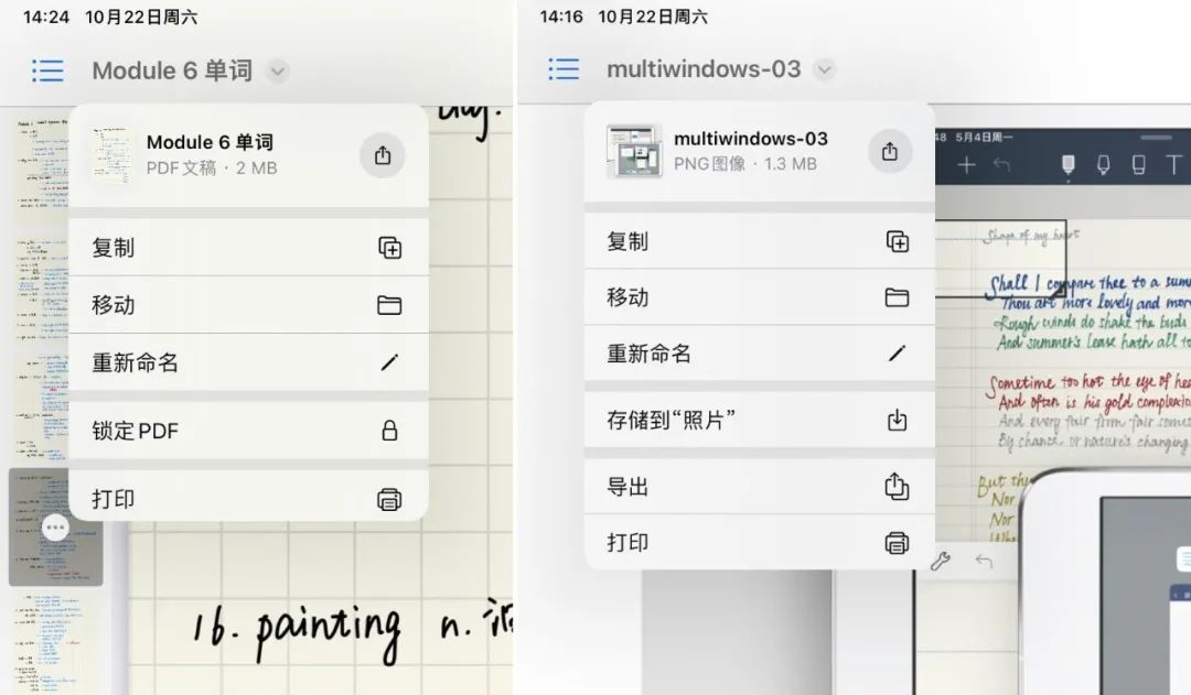 iPadOS 16.1 带来的另一处改进,就是当在「文件」等支持文档管理的 app 中打开某个文档时,我们可以直接从菜单栏对文件进行一些快捷操作。例如,在「文件」app 中打开图片时,我们可以通过点击文件名来进行一系列文件操作,例如移动、复制,或者直接把图片储存进入照片图库;打开 PDF 时,我们可以进行锁定 PDF、打印等操作。