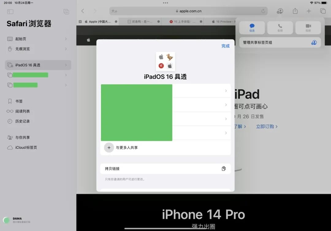 iPadOS 16.1 也支持了更多与协作有关的功能,在不同的 iPad 用户之间实时共享更多协作功能,例如 Safari 的「共享标签页组」功能、新的「无边记」app 等。此外,我们还可以在支持协作的 app 中给其他用户发送协作邀请,邀请他们一起参与文件的编辑与修改。